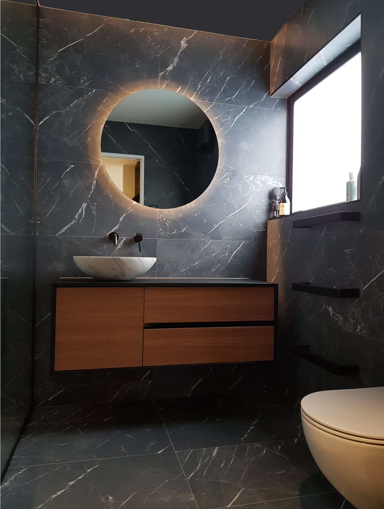 Bathroom renovation. Our clients Garren and Claire have nailed it with their design selections. Floating Vanity, Floor to Ceiling Shower Screen, Satin Black Fixings and Rainhead Shower.